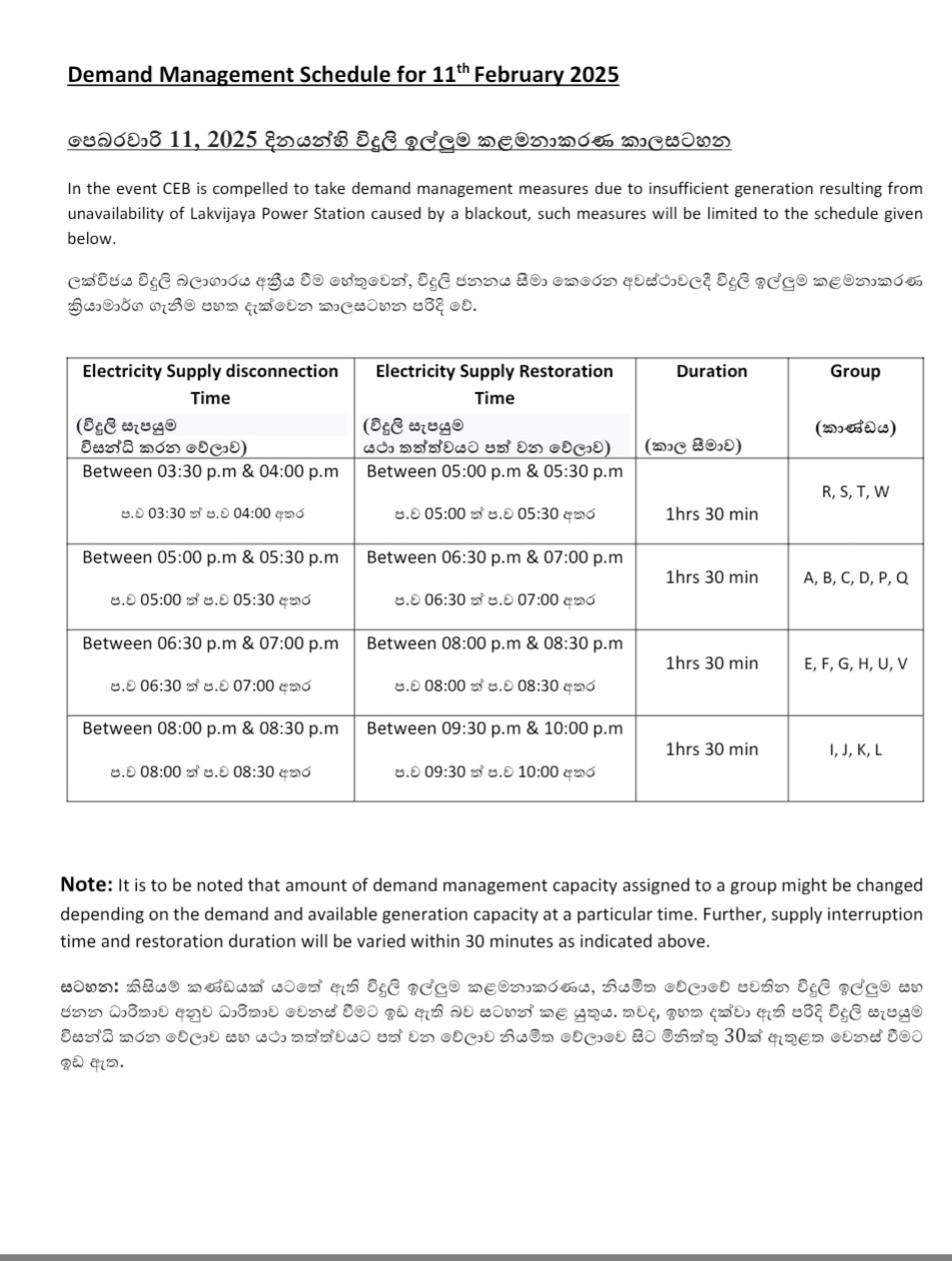 ඊට අමතරව පාරිභෝගික ගිණුම් අංකය කෙටි පණිවිඩයක් මගින් 1987 ක්ෂණික දුරකථන අංකයට යැවීමෙන් ද විදුලි කප්පාදුව සිදුවන වේලාවන් පිළිබඳ දැනගත හැකි බව ලංකා විදුලි බල මණ්ඩලය සඳහන් කළා.