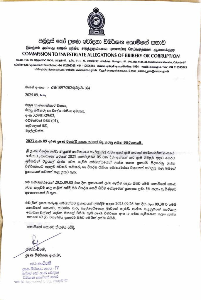ඊශ්රායලයේ කෘෂිකාර්මික අංශයේ රැකියා සඳහා මෙරට ශ්රමිකයින් යැවීම සම්බන්ධයෙන් සිදුකෙරෙන විමර්ශනයකට අදාළව ප්රකාශයක් ලබාදීම සඳහා හෙට (26) අල්ලස් කොමිසම වෙත පැමිණෙන ලෙස එම ලිපියෙන් දැනුම් දී ඇත.