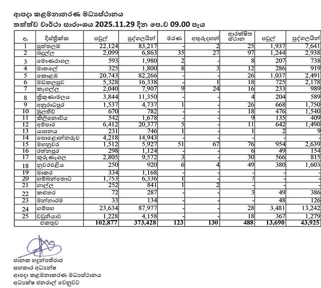 මේ වනවිට දිස්ත්රික්ක 25කට අයත් පවුල් 102,877ක පුද්ගලයින් 373,428 දෙනෙකු ආපදාවට ලක්ව තිබේ.