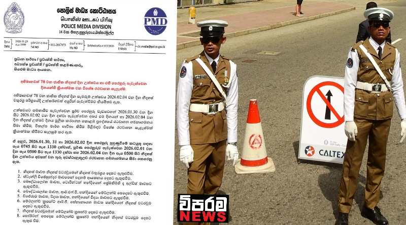 78වන ජාතික නිදහස් දින උත්සවය හා එහි පෙරහුරු පැවැත්වෙන දිනයන්හි ක්රියාත්මක වන විශේෂ රථවාහන සැලැස්ම පිළිබඳව පොලීසියෙන් නිවේදනයක් නිකුත්කර තිබෙනවා.