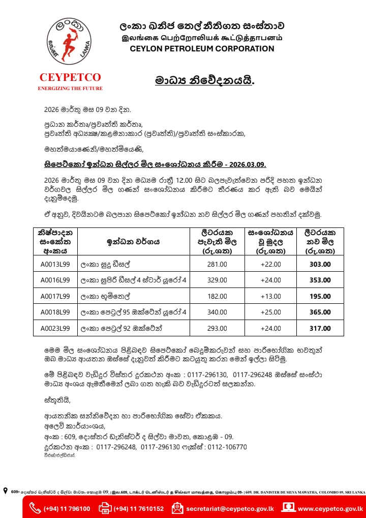 Breaking FEATURED Local News ඉන්ධන මිල ඉහළට March 9, 2026March 9, 2026312 Views admin 0 Comments අද (09) මධ්යම රාත්රියේ සිට ඉන්ධන මිල ගණන් සංශෝධනය කිරීමට තීරණය කර තිබෙනවා. වැඩ් වූ ම්ල ගණන් පහතින් Post Views: 270